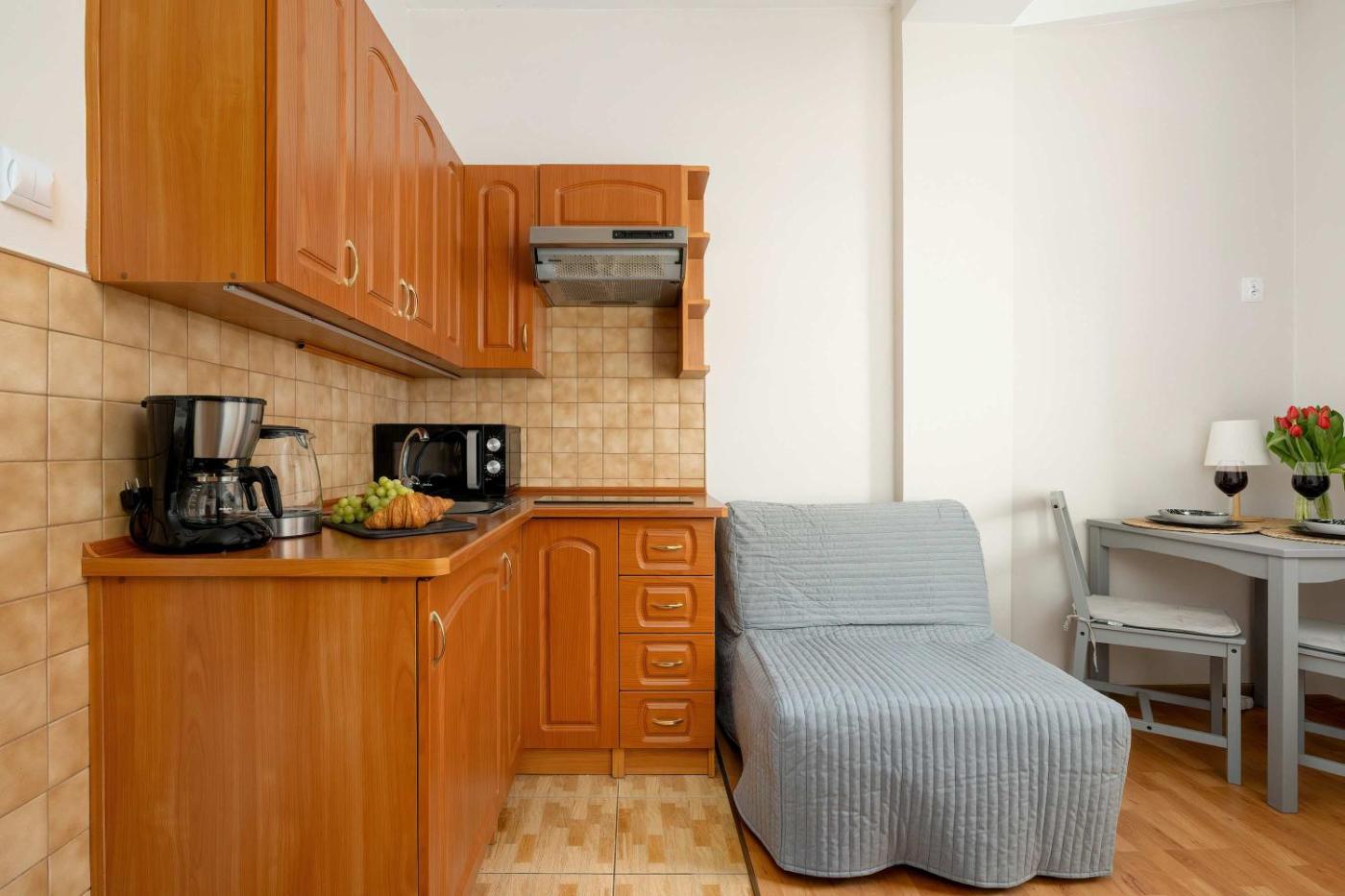 Studio. The studio features a private bathroom, a private entrance, a tea and coffee maker, as well as a seating area with a flat-screen TV. In the kitchenette, guests will find a stovetop, a refrigerator, kitchenware and a microwave. The studio offers a dining area, a wardrobe, a sofa, parquet floors and a TV. The unit offers 1 bed. Studio - 3 osobowy. Powierzchnia pokoju ok.: 15 mkw.