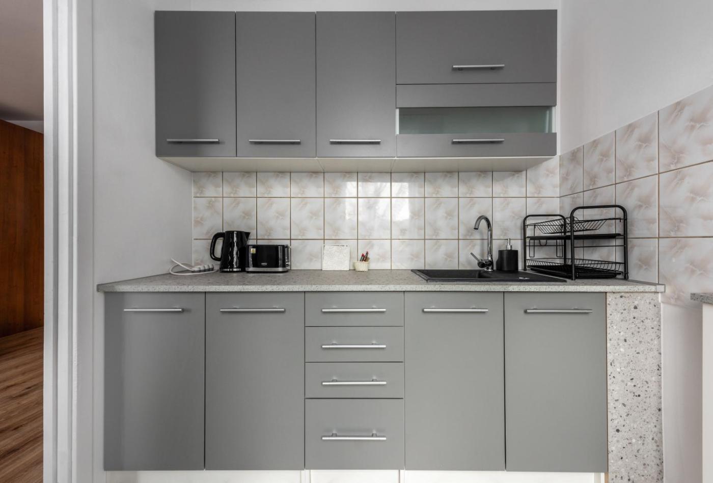 Apartament typu Standard. This apartment comes with 1 bedroom, a kitchen and 1 bathroom with a bath and a hairdryer. In the fully equipped kitchen, guests will find a stovetop, a refrigerator, kitchenware and a microwave. The apartment features a washing machine, a tea and coffee maker, a dining area, a flat-screen TV with satellite channels, as well as city views. The unit has 1 bed. Apartament - 2 osobowy. Powierzchnia pokoju ok.: 30 mkw.