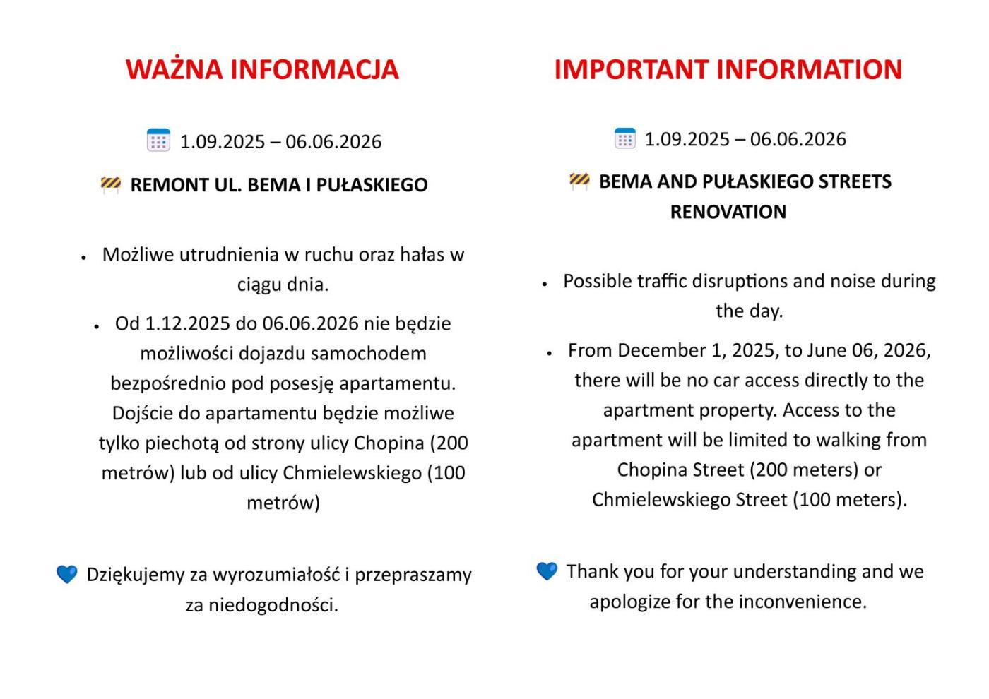 Goście, którzy chcą otrzymać fakturę za opłacony pobyt, proszeni są o wpisanie stosownej prośby w miejscu na uwagi w formularzu rezerwacji (przed dokonaniem płatności).W obiekcie obowiązuje zakaz organizowania wieczorów panieńskich, kawalerskich itp.