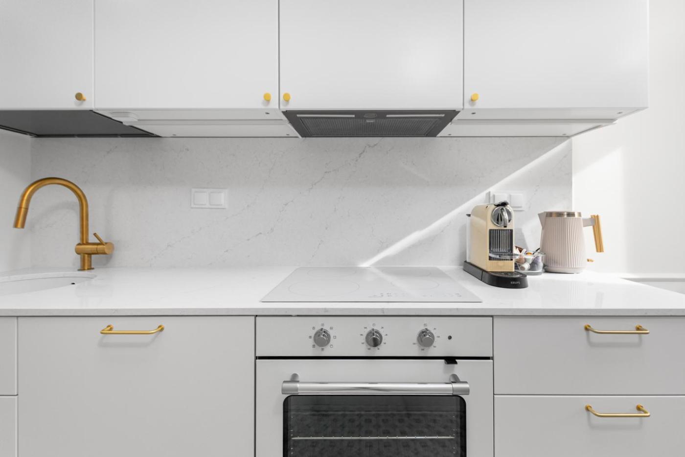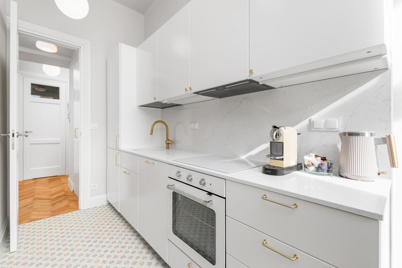 Oferta apartamentu obejmuje sypialnię (1), salon, kuchnię z pełnym wyposażeniem, w tym lodówką i ekspresem do kawy, a także łazienkę (1) z prysznicem oraz suszarką do włosów. W apartamencie zapewniono ręczniki i pościel.